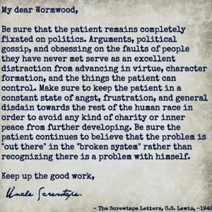 And, as a subtext, or even context, if you haven’t yet read The Screwtape Letters by C.S. Lewis, consider this a strong recommendation.