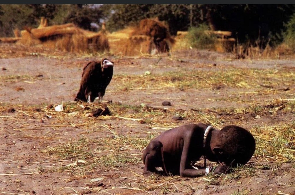In the 1990’s there was a widely circulated photo of a vulture waiting for a starving little girl to die and feast on her corp. That photo was taken during the 1993/94 famine in Sudan, by Kevin Carter, a South African photojournalist, who later won the Pulitzer Prize for this ‘amazing shot’.*